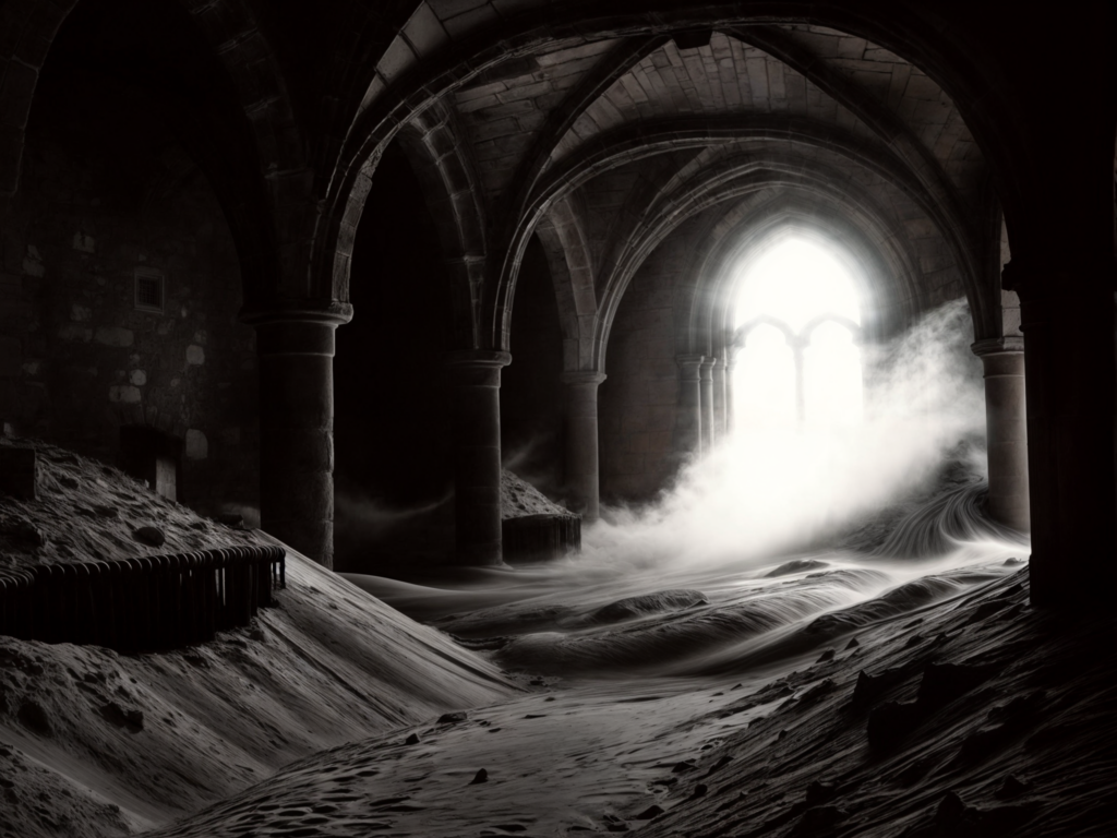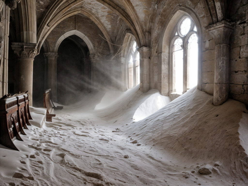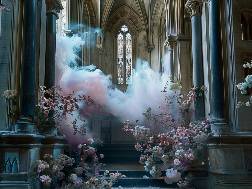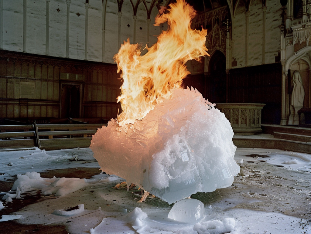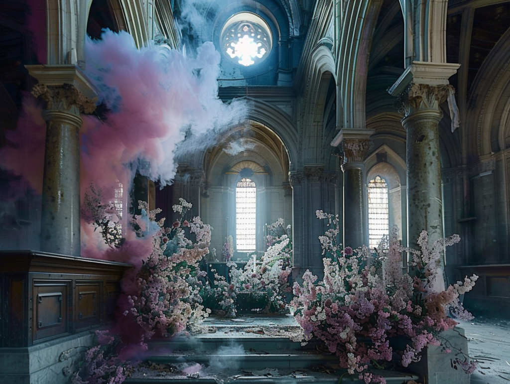 Série d’image qui explore la transformation d’églises à travers des éléments surprenants et contrastés : une église mêlant glace et feu, une autre envahie par le sable, et enfin une église abandonnée, enveloppée dans une brume rose. L’objectif est d’explorer comment des lieux de spiritualité peuvent être réimaginés dans des contextes surréels, en jouant avec des éléments naturels et symboliques.