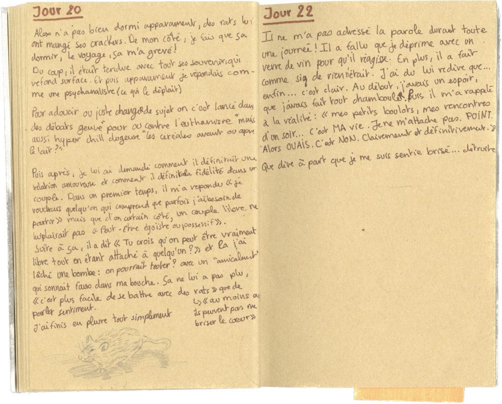 Ceci est mon journal de bord. C’est un résumé de nos discussions et ma vie au quotidien.