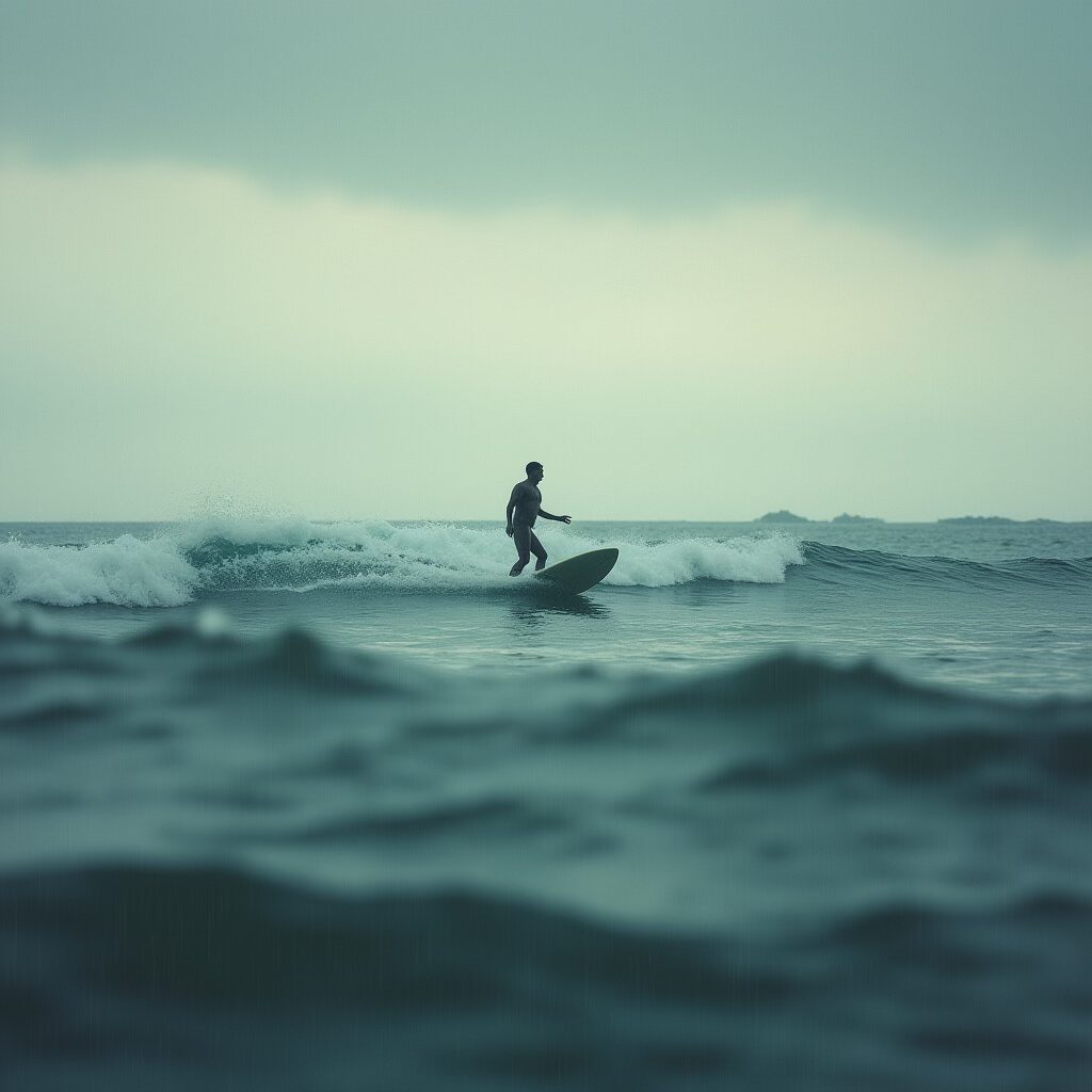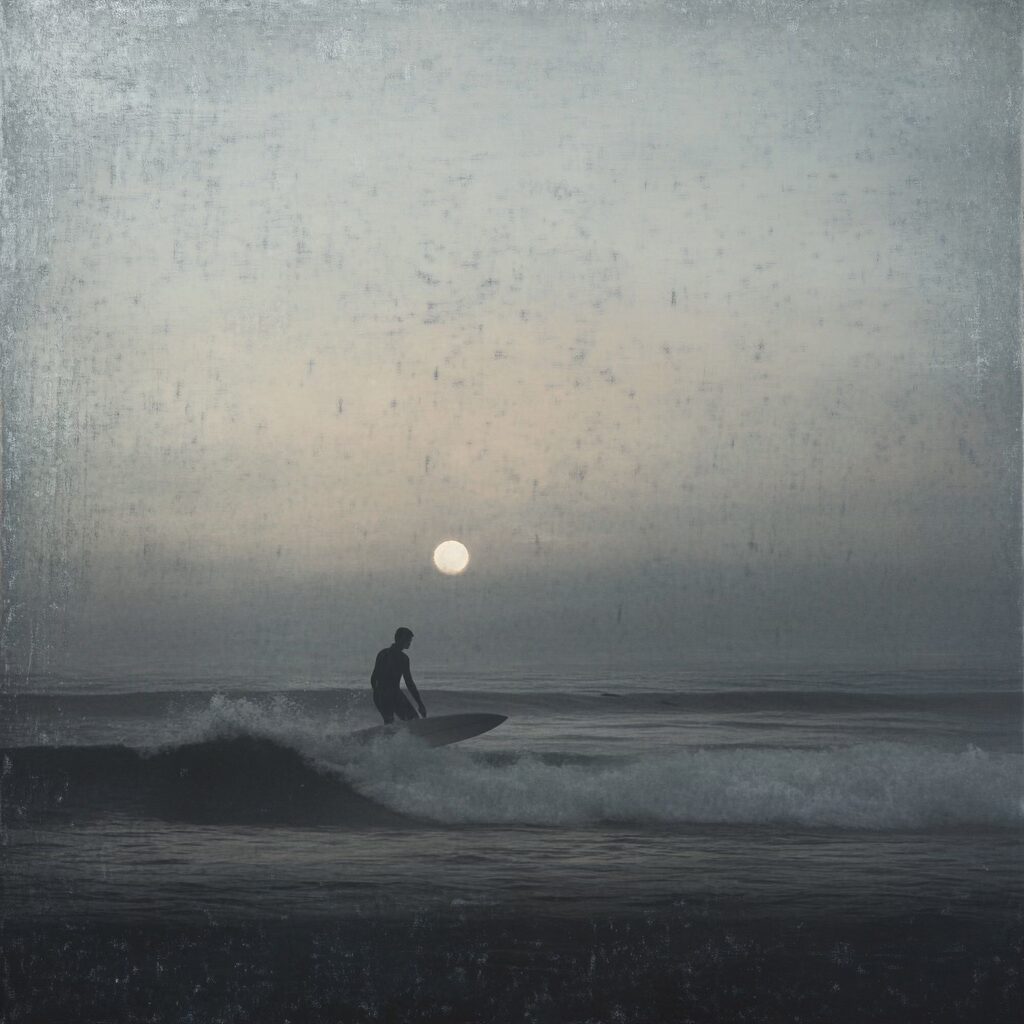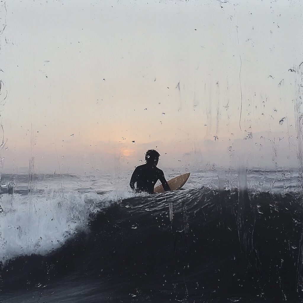 Au tout début, j’ai focalisé de manière assez frénétique sur l’ambiance de la session de surf dont je me souvenais, j’ai utilisé Midjourney pour générer des visuels qui retranscriraient cette illusion dont j’avais le faux souvenir.
