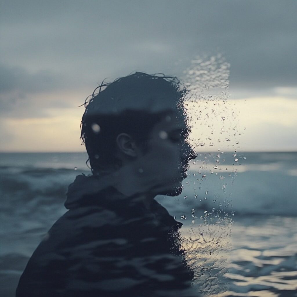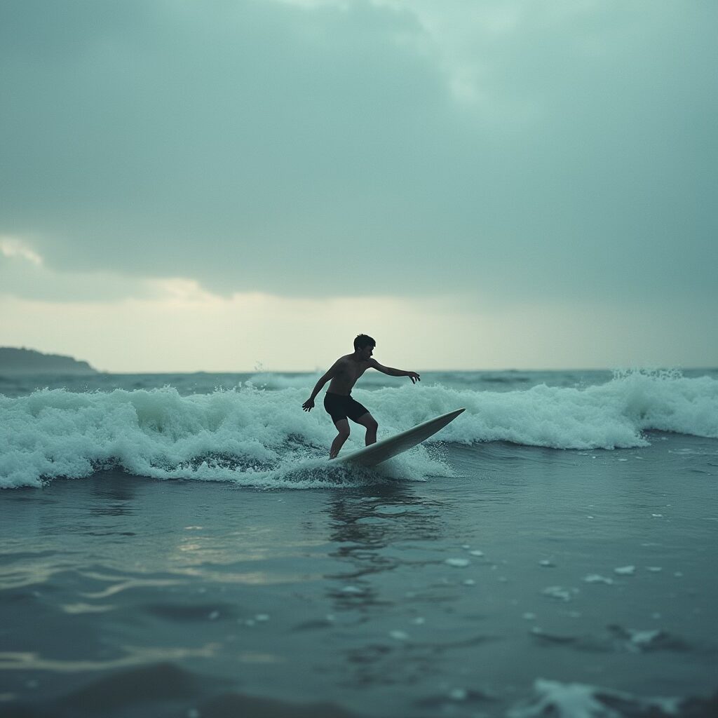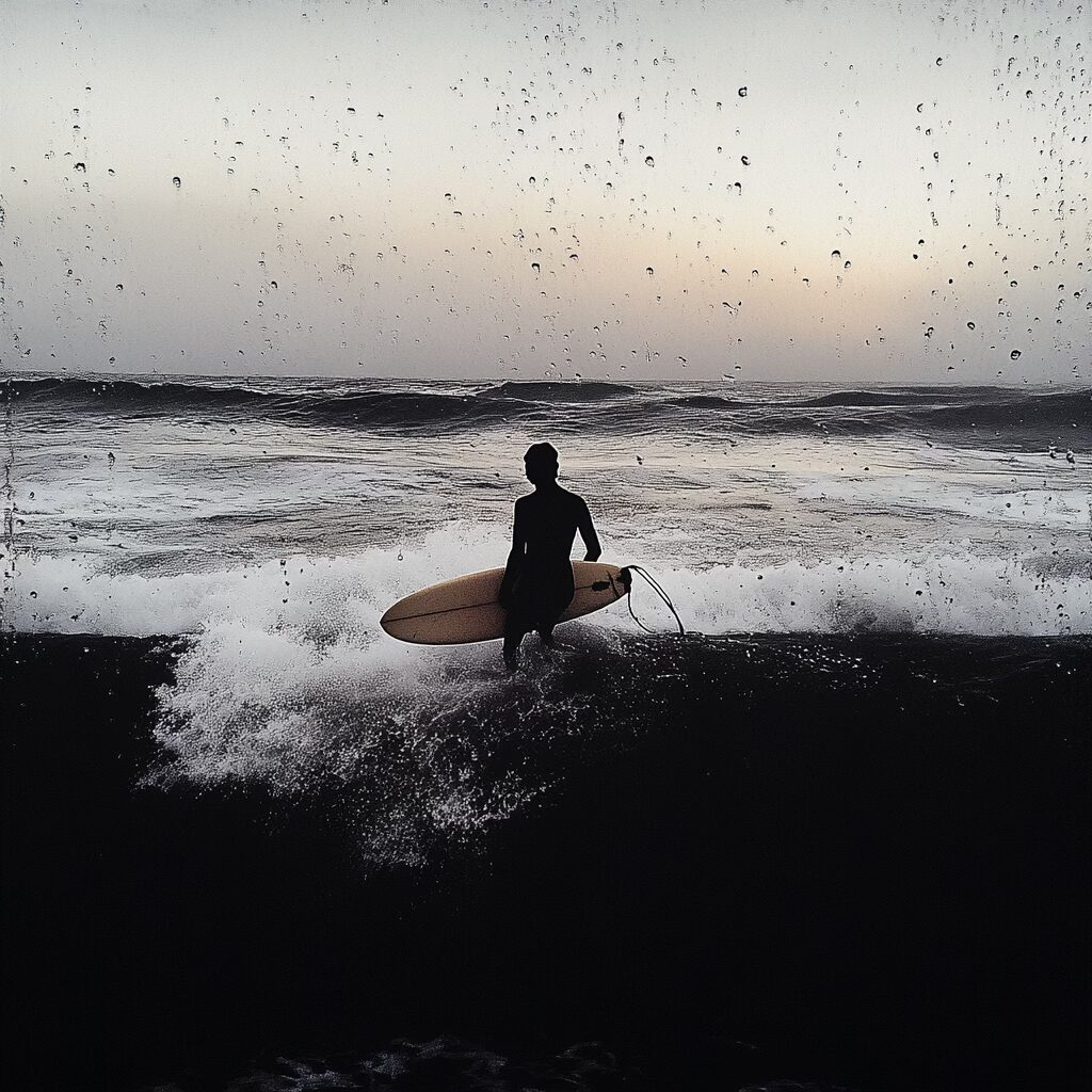 Au tout début, j’ai focalisé de manière assez frénétique sur l’ambiance de la session de surf dont je me souvenais, j’ai utilisé Midjourney pour générer des visuels qui retranscriraient cette illusion dont j’avais le faux souvenir.