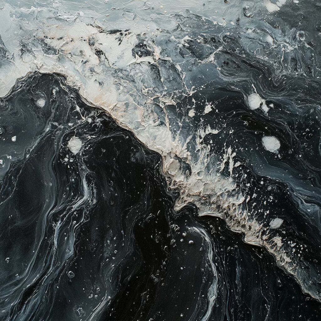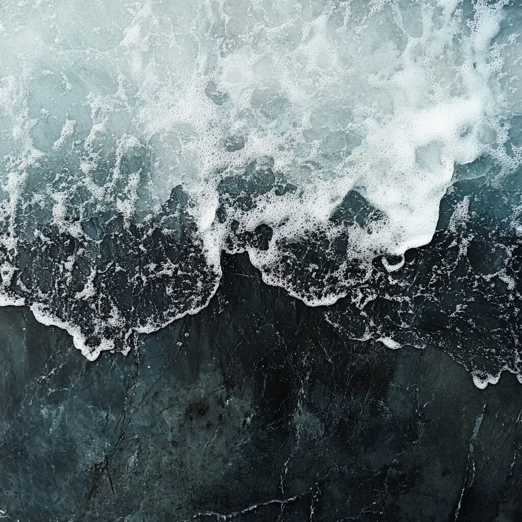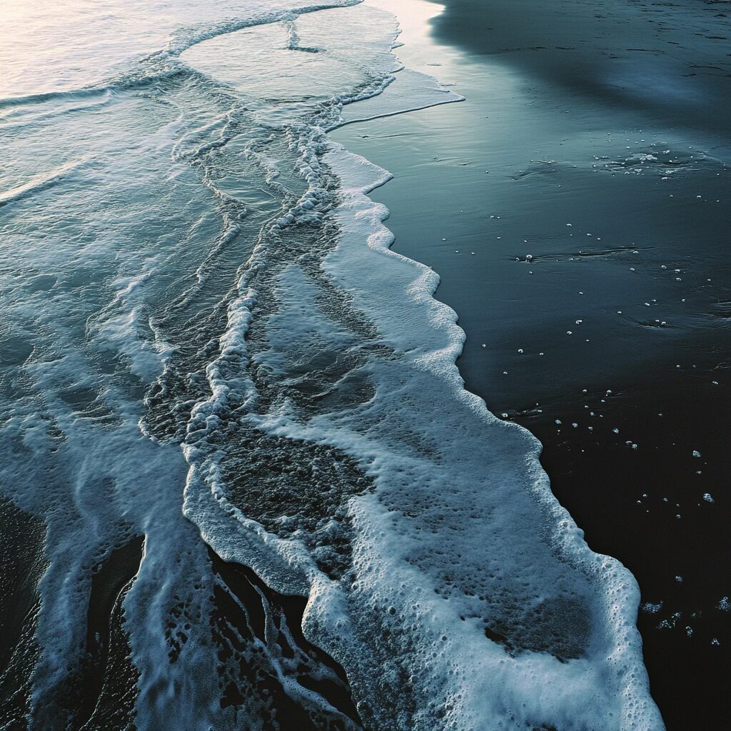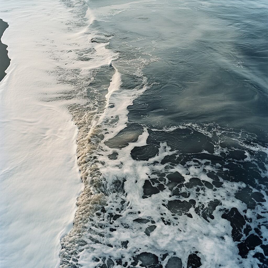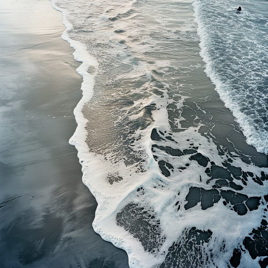 Voilà le prompt donne les images ci-dessus : » Une scène marine saisissante à l’aube, où la mer glacée dévoile une palette complexe de textures et de couleurs. L’eau, sombre et marbrée comme du métal liquide, présente des nuances d’étain, parcourues de veines gris acier et bleues. De fines particules blanches, semblables à du sucre ou du givre, flottent à la surface, poudrant les ondulations glacées. Les surfeurs, enveloppés dans des combinaisons noires étanches, semblent sculptés dans le contraste, leurs corps luisants sous l’humidité froide. La mer se creuse et se tend comme un drap de satin froissé, avec des vagues bombées et lisses, où chaque rideau d’écume est une dentelle mouvante. Le ressac mêle des galets roulants, dont la texture rugueuse apparaît sous l’eau translucide. À 200 mètres, la tension des vagues se calme, formant un line-up comme une plaine liquide infinie. L’air est mordant, chargé d’humidité glacée, et la lumière grise enveloppe l’ensemble dans une atmosphère froide et minérale. «