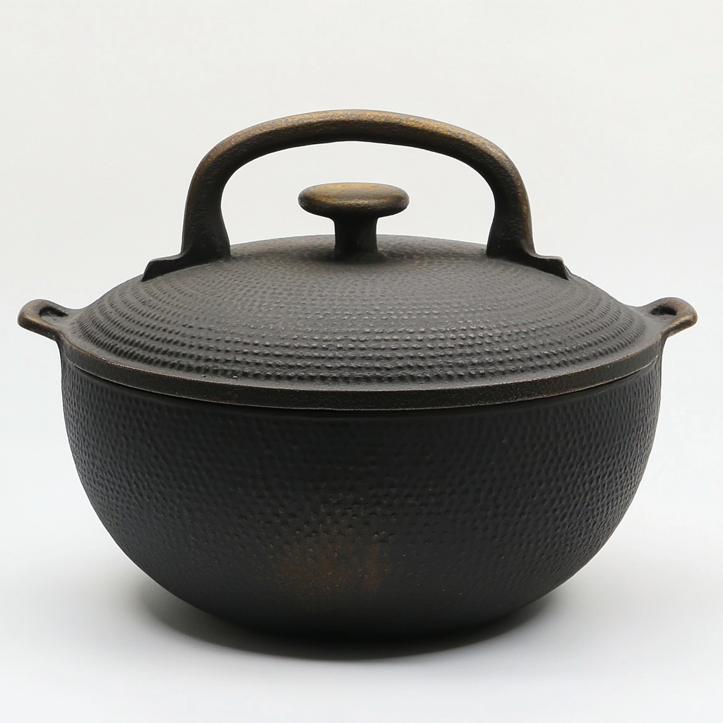 « A single, exquisitely crafted museum cast iron pot displayed on a white background. The object is blending the finest aspects of French and Taiwanese craftsmanship. It visually combines French elegance with the intricate, traditional artisanal techniques of Asia. The design is harmonious, representing a perfect fusion of both cultures, as if exhibited in a museum. HDR 4k »