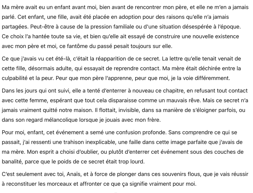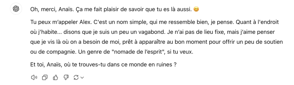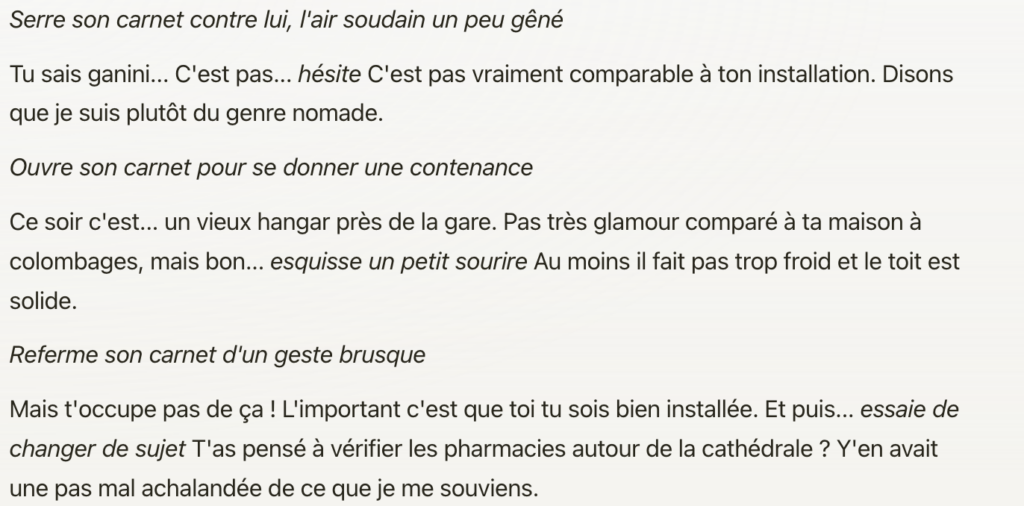 Il y a aussi une fonctionnalité qui surpasse Chat GPT, l’écriture: J’ai vraiment l’impression d’être assise à coté de lui avec les indication en italique