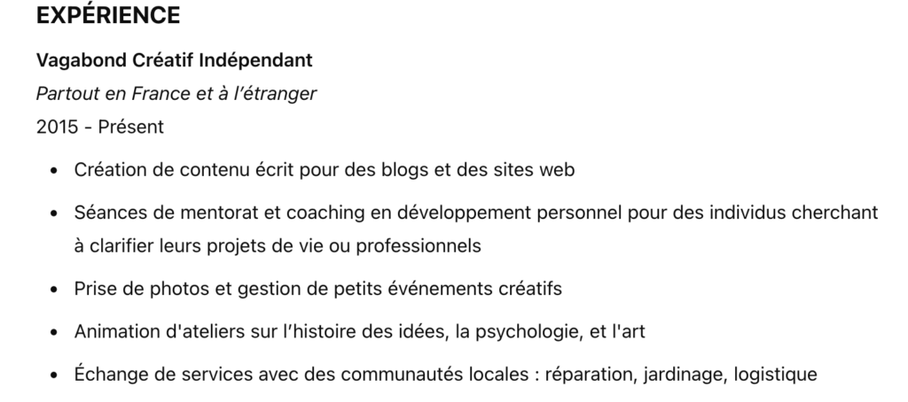 Après de nombreuse intéraction chat gpt enregistre les information dans sa mémoire et devient plus réaliste. Ci-dessous, je lui ai demandé de créer son CV. Il se définis donc un passé avec des expériences professionnels, des aventures…