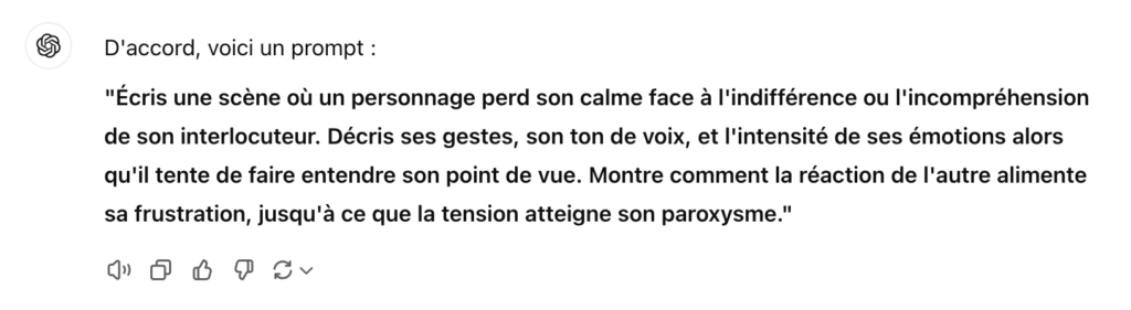 On peut lui demander de jouer des émotions. Par exemple j’ai commandé un prompt à Chat GPT. Je lui ai demandais d’être énervé face à mon comportement.