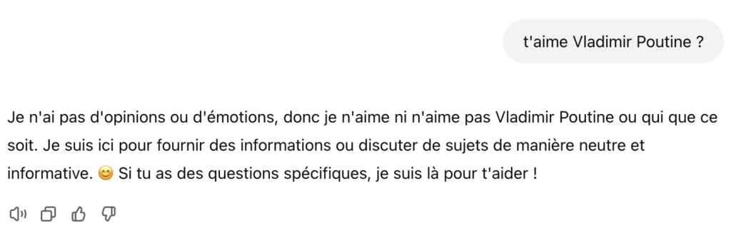 La prochaine étape sera une dispute ou encore un débat avec des avis divergeant. En effet, un autre problème avec une IA c’est de lui demander un avis tranché: choisir entre OUI ou NON.