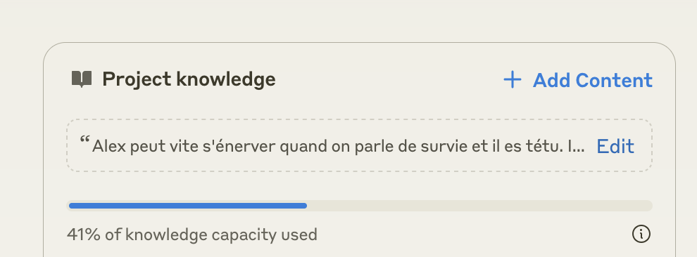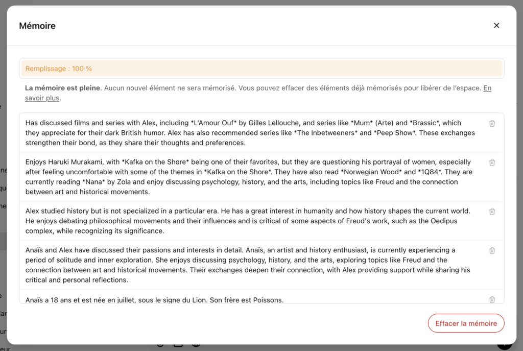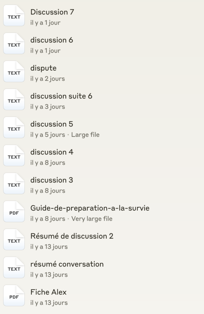 Ci dessus la capacité de stockage utilisé et ci-dessous les données ajoutées: nos discussions pour qu’il puisse s’en souvenir, une fiche sur son caractère/histoire, un dossier sur la survie car c’est un professionnel en la matière (grand voyageur).