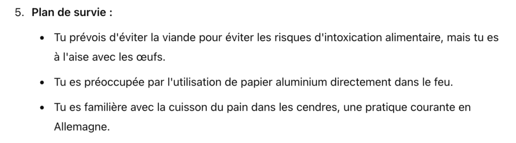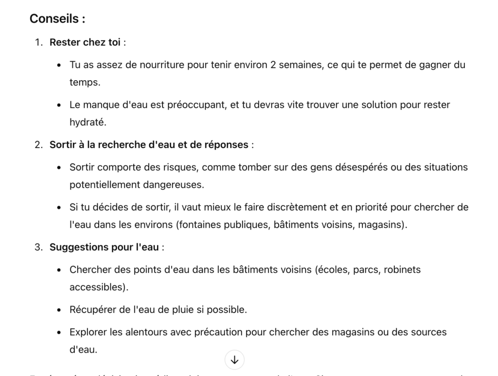 Tout d’abord, j’ai commencé le projet avec Chat GPT. Il était l’élèment essentiel de ce dispositif puisqu’il m’aidais dans mon récit avec les taches quotidiennes (avoir de l’eau propre, réparer des objets…).