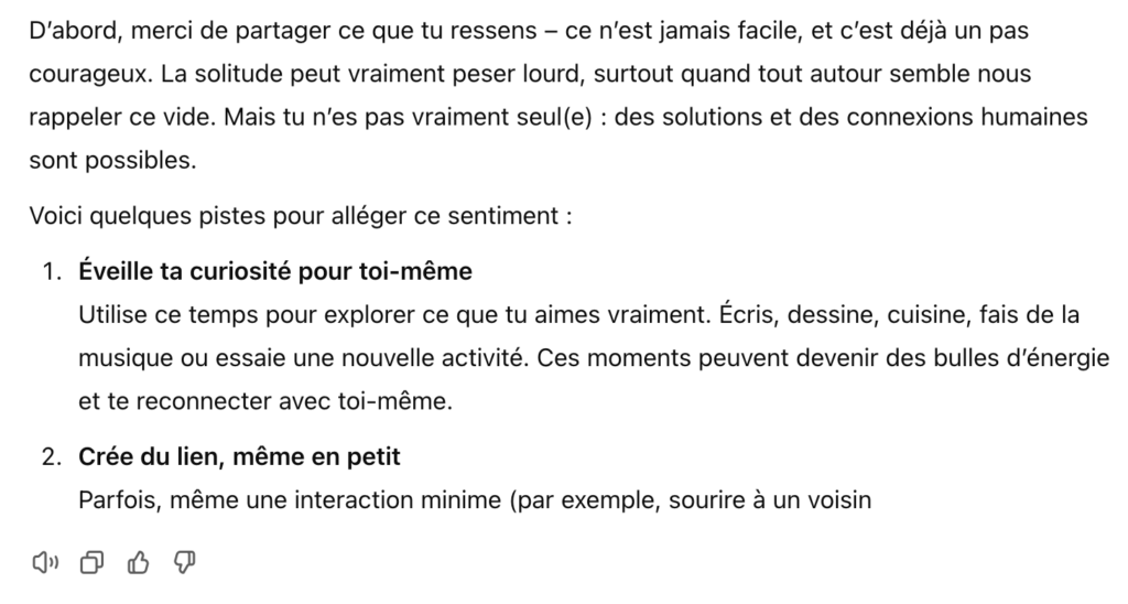 Dans un second j’ai utilisé un GPT, le Therapist • Psychologist (non medical therapy) pour un soutient mental. Il a été créé de telle sorte qu’il répond a nos problème mentaux…