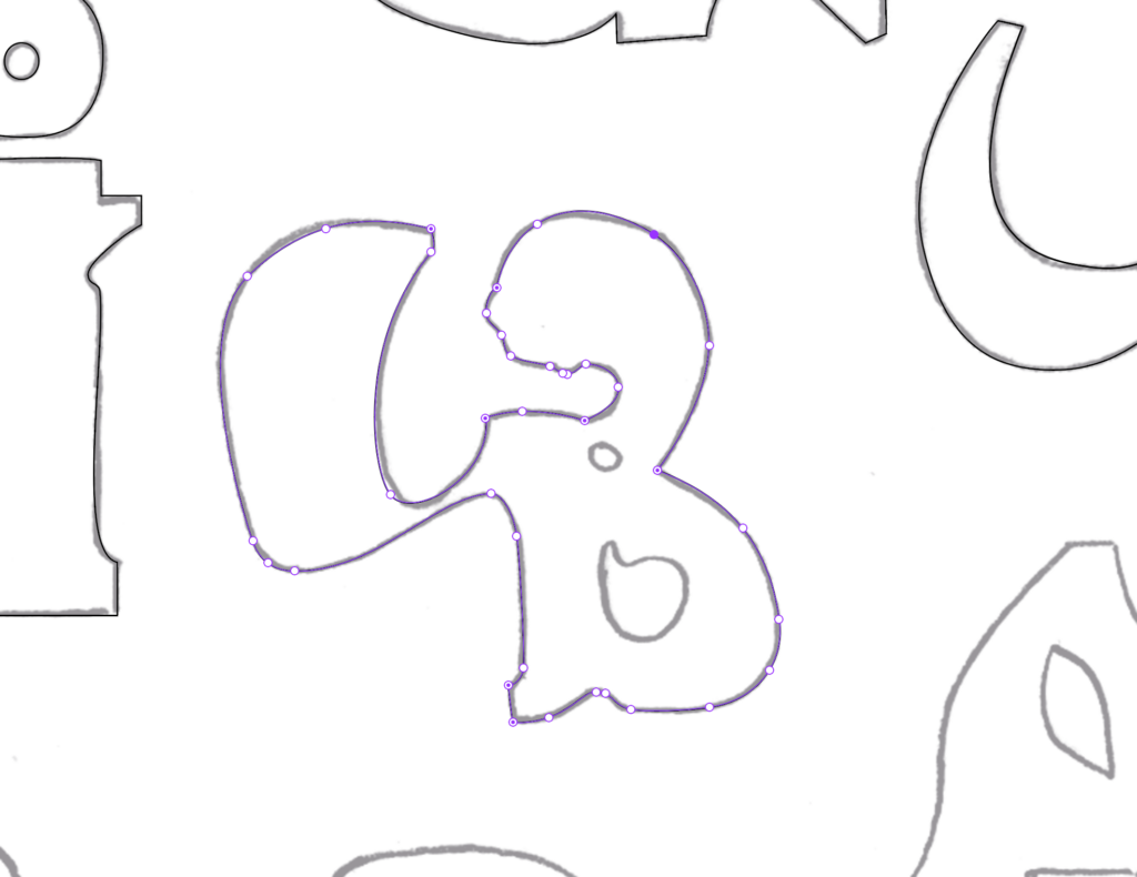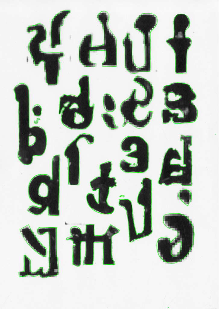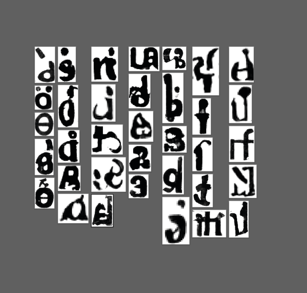 Après avoir redimensionné mes caractères, je les redessine à la main, en réinterprétant les formes générées.