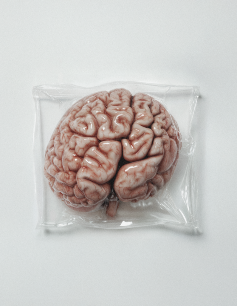 « Hyper-realistic image of a human brain vacuum-sealed in a transparent plastic bag, placed on a clean, white background. The brain appears detailed with visible grooves and realistic texture, slightly glossy due to the plastic compression. The plastic bag tightly wraps around the brain, showing wrinkles and reflections from the light, creating a sterile and surreal atmosphere. Soft shadows and subtle lighting enhance the clinical, unsettling mood »