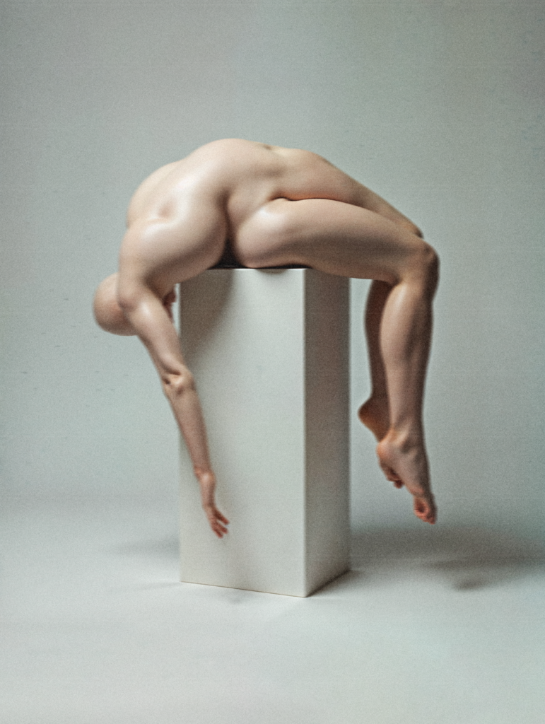 « Hyper-realistic image of a nude human figure without a spine, slumped limply over a white pedestal. The body appears boneless and fluid, with limbs hanging loosely, emphasizing its fragility and lack of structure. Surreal and eerie atmosphere, with soft lighting and a neutral gray background that highlights the sense of helplessness and vulnerability »
