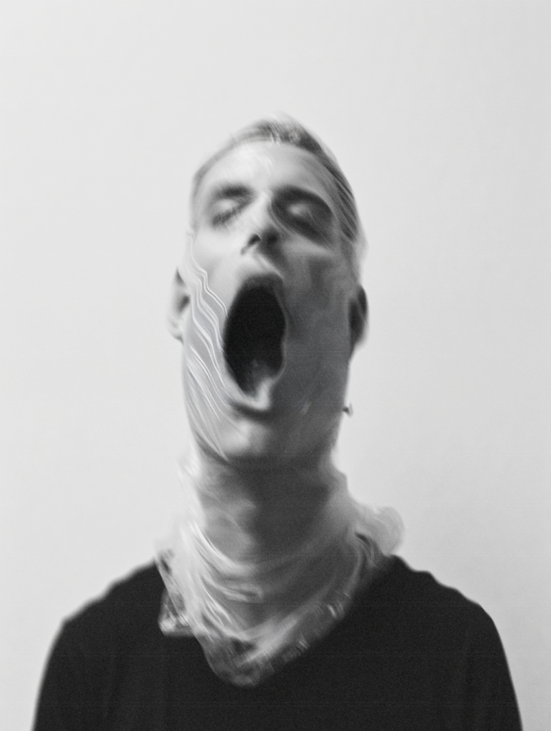 « An eerie, black and white portrait of a person screaming wrapped entirely in transparent plastic. the mouth is opened. The plastic is taut, distorting the features beneath and creating a claustrophobic, tense feeling. The figure’s face is barely visible, shrouded in the plastic, with subtle details of the form underneath. The background is neutral and minimal, focusing on the person, who wears dark clothing, enhancing the contrast with the shiny, crinkled plastic »